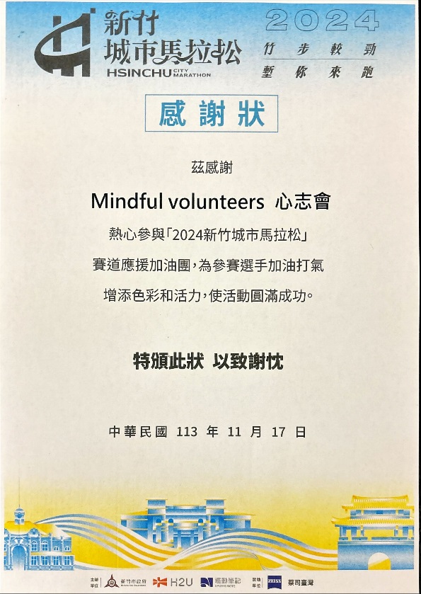 心志會志工隊|收到來自新竹城市馬拉松的感謝狀